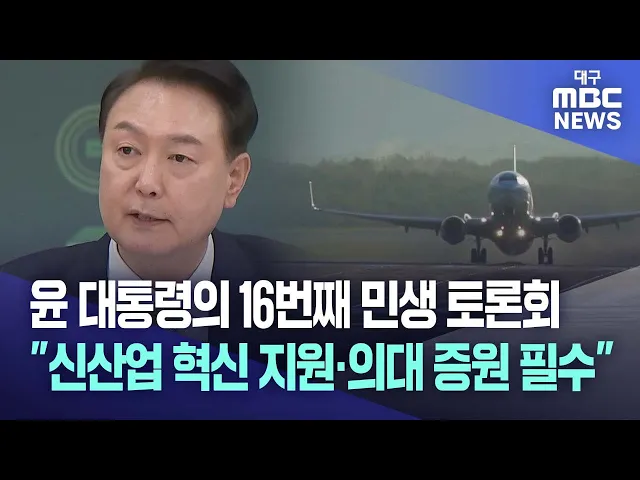 ◀앵커▶윤석열 대통령이 부·울·경, 대전, 충남 등에 이어 16번째 민생 토론회를 대구에서 열었습니다.한 달여 남은 총선 지원 행보 아니냐는 비판에도 지역 현안 해결과 지원을 약속했는데요.가장 뜨거운 이슈인 의대 정원 확대에도 많은 시간을 할애했습니다.김은혜 기자입니다.◀기자▶'첨단 신산업으로 우뚝 솟는 대구'를 ...