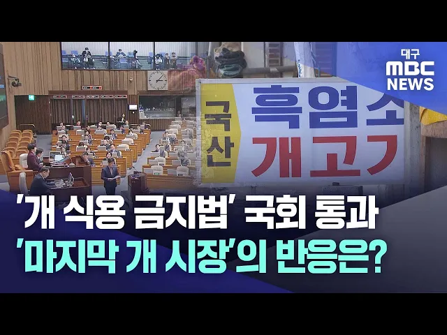 ◀앵커▶‘개 식용 목적 사육·도살·유통 등 종식에 관한 특별법’이 1월 9일 국회를 통과했습니다.앞으로 식용 목적으로 개를 도살·유통하고, 판매하면 형사 처벌 대상이 됩니다.국내 3대 개 시장 중 유일하게 남은 칠성 개 시장도 폐쇄가 불가피하게 됐습니다.상인들은 '올 것이 왔다'면서도 '다만 폐업이나 업종 전환에 적절...