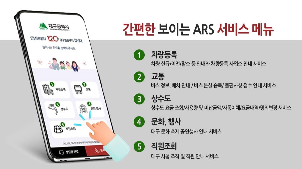 사진 출처 대구시대구시 120 달구벌 콜센터가 2023년 12월부터 '보이는 ARS' 서비스를 제공하면서 AI, 인공지능 상담 시스템 도입을 본격화합니다.보이는 ARS로 상담이 많은 교통, 문화행사, 상수도, 직원 조회 등은 상담원을 통하지 않아도 휴대전화 화면으로 조회가 가능합니다.120 달구벌 콜센터에 AI 상담 시스템 구축...