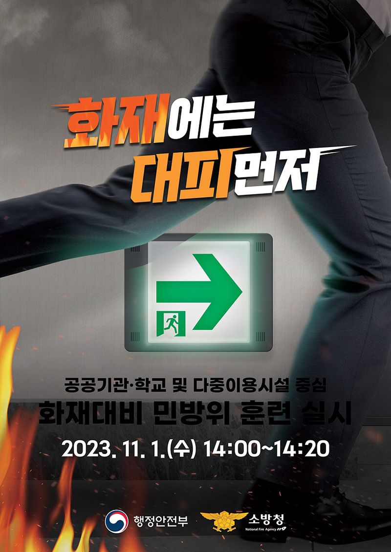 11월 1일 오후 2시부터 20분 동안 행정안전부 주관으로 화재 대비 민방위 훈련과 소방차 길 터주기 훈련이 진행됩니다.화재 대비 민방위 훈련은 관공서, 공공기관, 초·중학교, 일부 대형마트와 영화관 등 다중이용시설에서 진행되며, 화재 발생 시 지정 대피 구역으로 대피, 소화전 사용법, 심폐소생술 교육 등이 실시됩니...