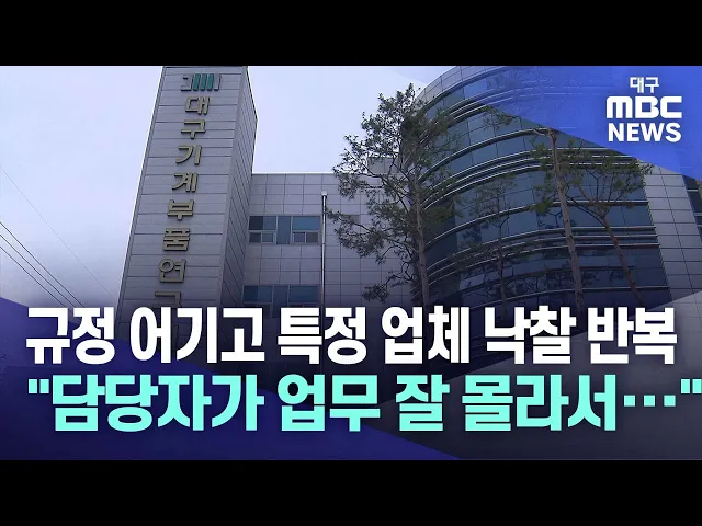 ◀앵커▶대구기계부품연구원 관련한 의혹이 잇따라 제기되고 있습니다. 이번에는 규정을 어기고 연구원이나 대구시 사업에 필요한 물품, 장비를 구매하는 입찰을 진행했다는 의혹입니다.연구원 측은 담당자가 업무에 미숙했을 뿐, 특정 업체 몰아주기는 없다고 밝혔습니다.김은혜 기자입니다.◀기자▶대구기계부품연구원은 2019...