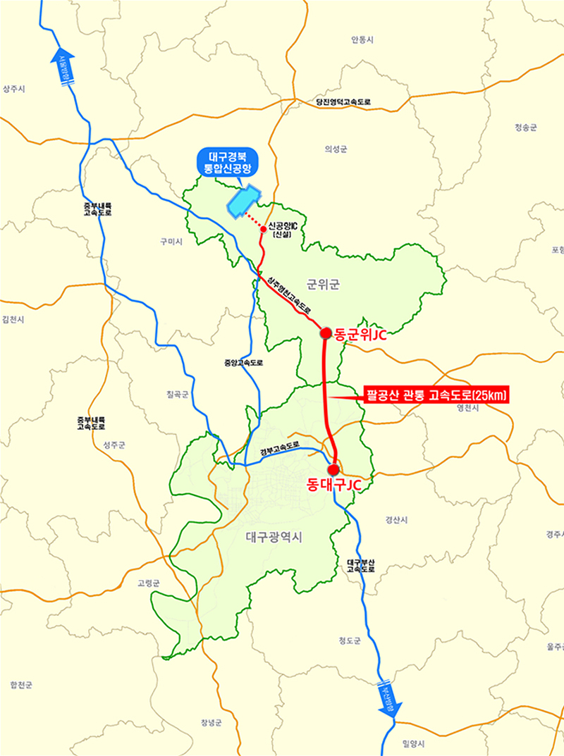 사진 제공 대구시대구경북신공항 접근성을 높이기 위해 추진 중인 팔공산 관통 고속도로가 민자사업으로 건설된 전망입니다.대구시는 동대구분기점에서 동군위분기점을 연결하는 25.3km 구간 고속도로를 오는 2030년, 대구경북신공항 개항에 맞춰 건설해 개통할 예정이라고 밝혔습니다.건설에는 1조 7천억 원이 들 것으로 ...