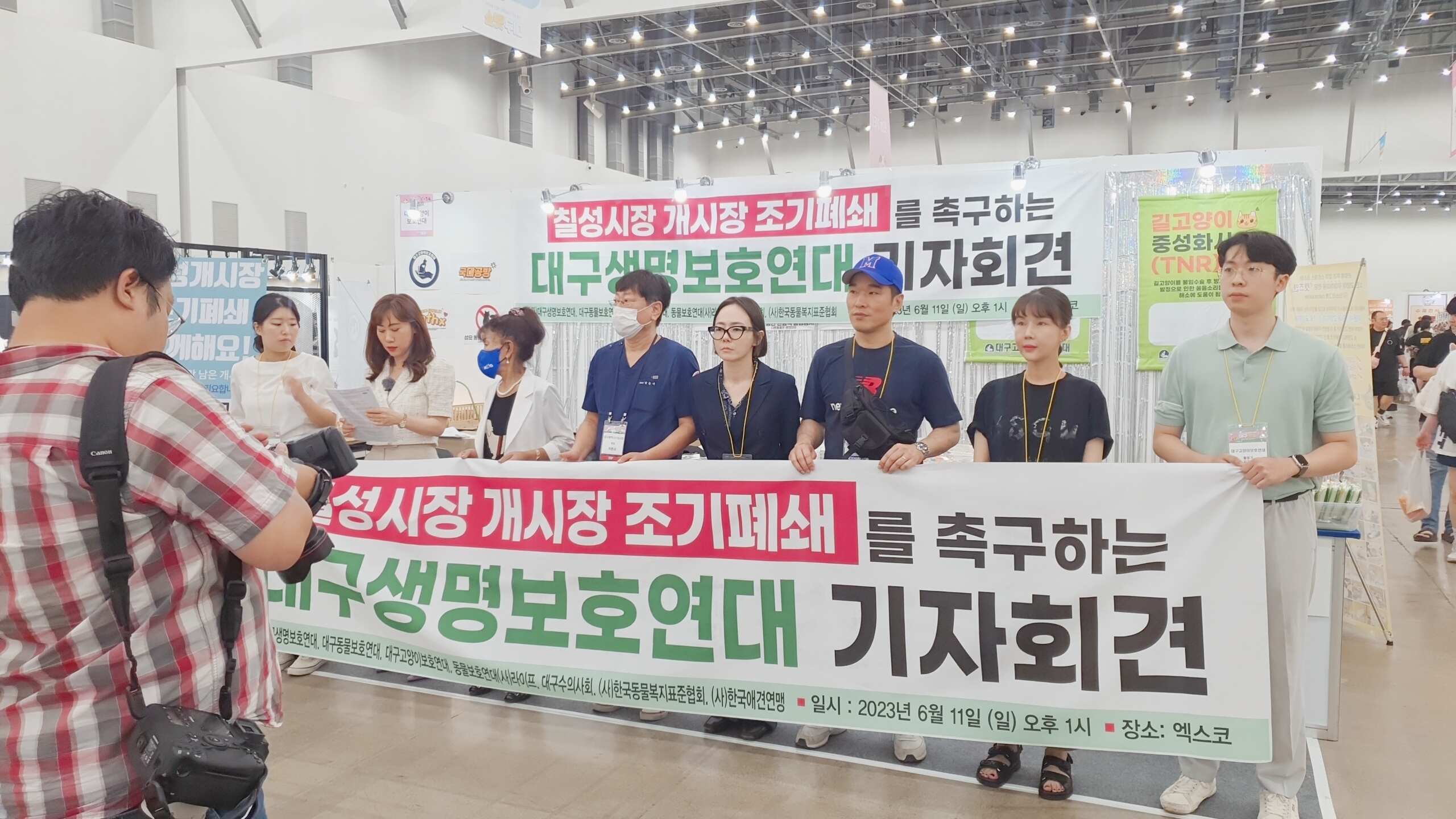 반려동물 관련 전시가 열린 대구 엑스코에서 칠성 개시장 조기 폐쇄를 촉구하는 기자회견이 열렸습니다.대구생명보호연대와 고양이보호연대, 대구수의사회 등 동물 관련 단체들은 기자회견을 통해 "다른 지역에서 개시장이 폐쇄됐지만 대구에서 유일하게 성업 중이라면서 이는 대구시와 관할 부서가 방조하기 있기 때문"이...
