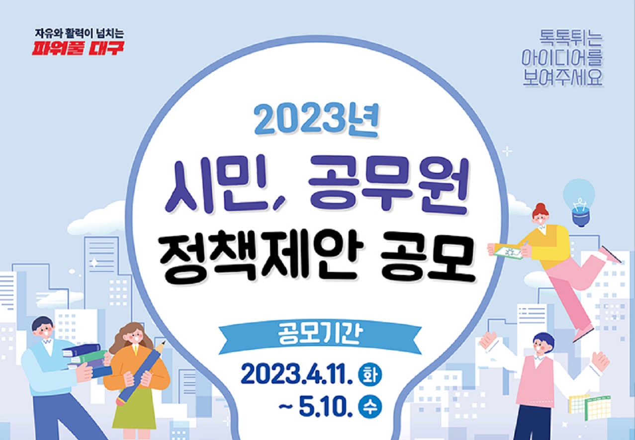 사진 제공 대구광역시대구시가 '2023 정책 제안 공모를 실시합니다. 공모 주제는 범죄예방을 위한 동네 환경개선, 대구시 청렴도 제고 방안, 대구로 택시 활성화 방안입니다.정책 제안은 4월 11일부터 5월 10일까지 대구시 누리집에 있는 토크대구, 우편, 방문 등을 통해 할 수 있습니다. 담당 부서 검토와 시민 온오프라인...