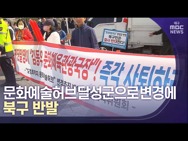 ◀앵커▶대구시의 일방적인 정책 변경에 화가 난 북구 주민들이 들고 일어났습니다. 문화예술 허브를 당초 북구에서 달성군으로 바꾸겠다는 발표 때문입니다.대구시가 농수산물 도매시장에 이어 대통령 공약마저 주민 의견 수렴없이 발표한 것은 주민을 우롱하는 처사라며 반발하고 있습니다.김은혜 기자입니다. ◀기자▶경북도...