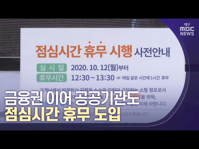 ◀앵커▶'점심 시간 휴무제' 들어보셨습니까? 대구에서는 지역 은행이 시중은행 최초로 이 제도를 도입해 운영한 지 2년이 됐습니다.그런데 2023년 부터는 관공서에서도 점심 시간 휴무제를 도입한다고 해서 말들이 많습니다.'법적으로 보장된 쉴 권리가 먼저냐', '세금을 내는 시민들의 편의가 우선이냐?'시행 전부터 찬반이...