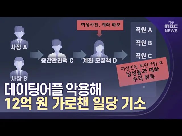 대구지방검찰청 서부지청은 '데이팅 어플'을 활용해 남성 가입자들로부터 환전이 가능한 포인트와 교제비 등을 편취한 혐의로 남성 3명을 구속 기소하고 공범 14명을 불구속 기소했습니다.검찰에 따르면 불구속 기소된 남성 13명은 지난 2019년 9월부터 최근까지 여성인 것처럼 소개팅 어플에 가입한 뒤 대화를 걸어온 남성...