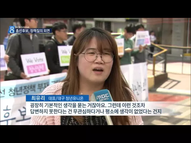 ◀ANC▶ 이번 총선이 정책이나 공약 대결보다는 정서에 호소하는 쪽으로 치우치고 있어 걱정이 많은데요. 시민단체가 보낸 정책 질의는 외면받고 있고, 법정 토론방송에 후보가 불참하는 등 유권자와의 소통도 실종되고 있습니다. 김은혜 기자입니다. ◀END▶ ◀VCR▶ 대구지역 청년단체가 총선 후보들을 규탄하며 거리...