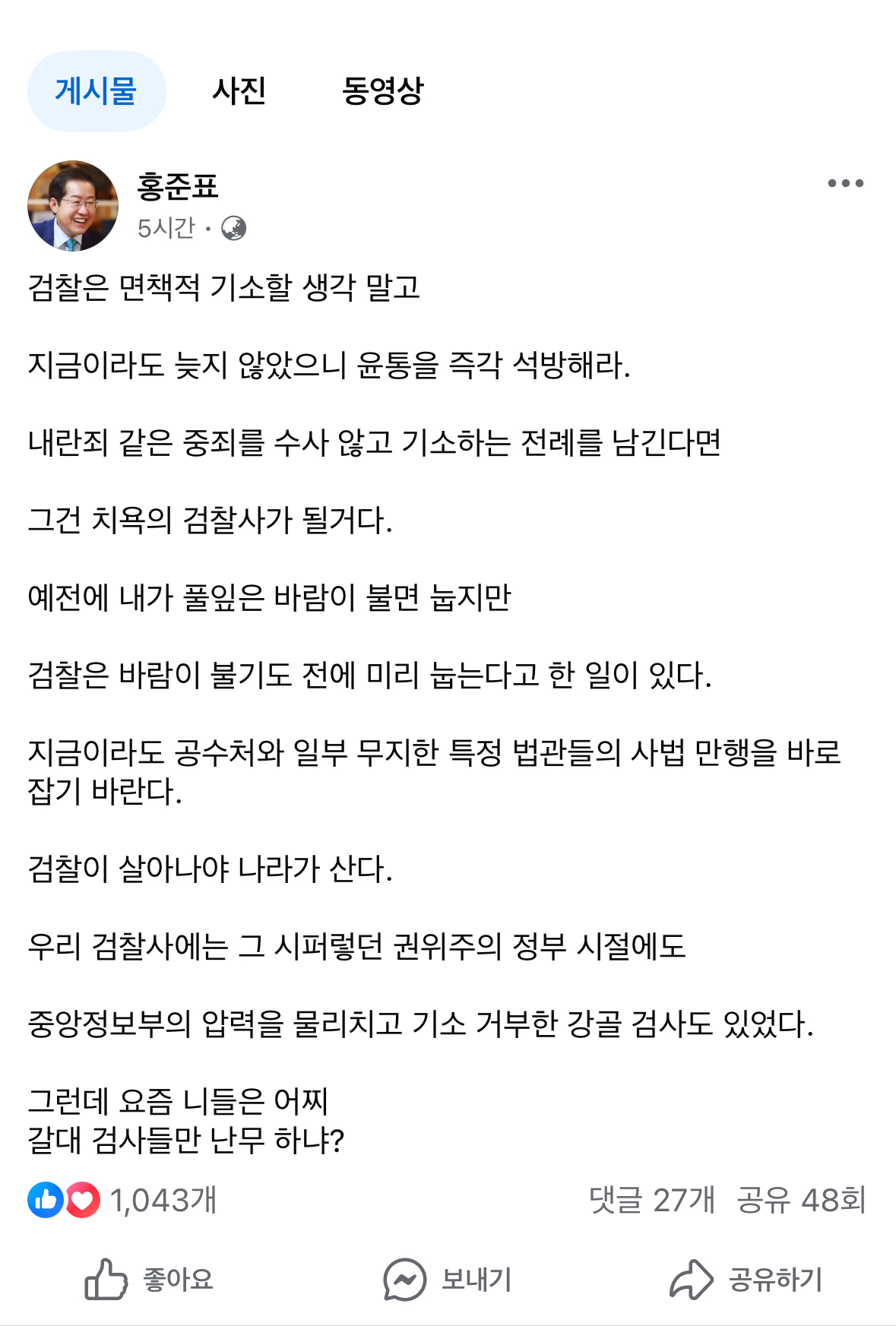 서울 중앙지법이 윤석열 대통령에 대한 구속기간 연장을 불허하자 여권을 중심으로 비판이 잇따르는 가운데 홍준표 대구시장도 즉각 석방하라고 비판하고 나섰습니다.홍 시장은 1월 24일, 밤, 자신의 SNS에 영장을 발부한 판사와 공수처 검사, 송치 받은 검찰을 비판하며 "내란죄가 그렇게 가볍게 장난치듯 처리할 범죄이던...