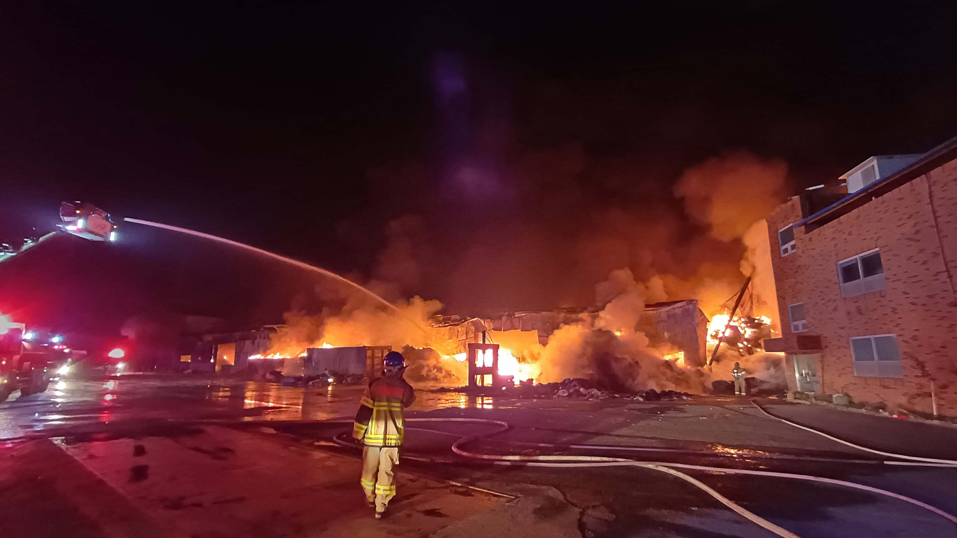 사진 제공 경북소방본부11월 8일 오전 2시 40분쯤 경북 경주시 서면의 한 폐기물처리시설에서 불이 나 소방 당국이 밤새 진화 중입니다.기숙사에 있던 직원 3명은 대피해 다친 사람은 없었지만 공장동과 사무동 등 건물 3개 동이 완전히 불탔습니다.소방 당국은 폐기물 더미에서 불이 시작된 것으로 보인다며 300톤가량의 ...