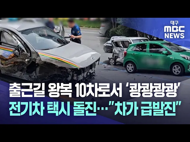 ◀앵커▶9월 11일 출근길 대구 도심 한가운데에서 전기차 택시가 신호 대기하던 차들을 들이받고 왕복 10차로 도로를 질주했습니다.모두 11명이 다쳤는데, 택시 기사는 급발진을 주장하고 있습니다.손은민 기자입니다. ◀기자▶버스정류장 앞에 택시 한 대가 멈춰 서 있습니다. 앞 범퍼는 어딘가로 날아가 버렸고 오른쪽 앞바퀴...