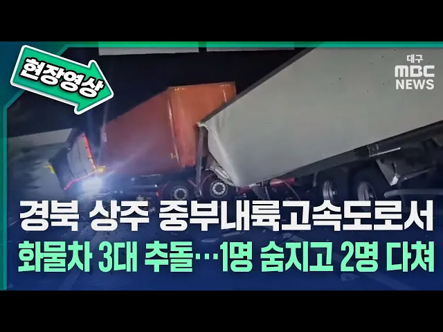 8월 29일 오전 1시 50분쯤 경북 상주시 낙동면 중부내륙고속도로 양평 방향 상주나들목 인근에서 화물차 3대가 잇따라 추돌했습니다.8.5톤 화물차가 앞서가던 6.5톤 화물차를 들이받았고, 뒤이어 오던 25톤 트레일러가 사고 차들을 피하지 못하고 추돌했습니다.이 사고로 8.5톤 화물차를 몰던 60대 남성이 숨졌고, 다른 운...
