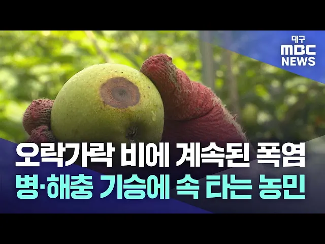 ◀앵커▶논과 밭에선 고온 다습한 날씨를 좋아하는 병해충들이 기승을 부리고 있습니다.수해를 겨우 벗어나는가 했는데, 푹푹 찌는 폭염과 병해충에 농민들은 속이 타들어 가고 있습니다.이 소식은 손은민 기자가 전해드립니다.◀기자▶날이 밝자마자 밭으로 나왔습니다.비지땀을 흘리며 사과나무 구석구석 약을 칩니다.◀박대구...