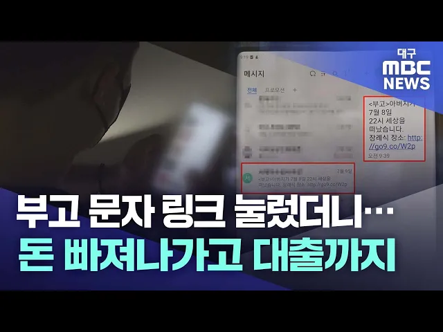 ◀앵커▶문자메시지로 휴대폰을 해킹해서 돈을 빼돌리는 '스미싱' 피해가 다시 급증하고 있습니다.경찰은 대구에 '주의보'까지 발령했습니다.제 지인도 최근 스미싱으로 추정되는 부고 문자를 받은 적이 있는데요,누가 보낸 어떤 문자든 웹 링크는 절대 클릭하지 말고, 안전 앱을 미리 설치해 놓는 게 좋겠습니다.손은민 기자...