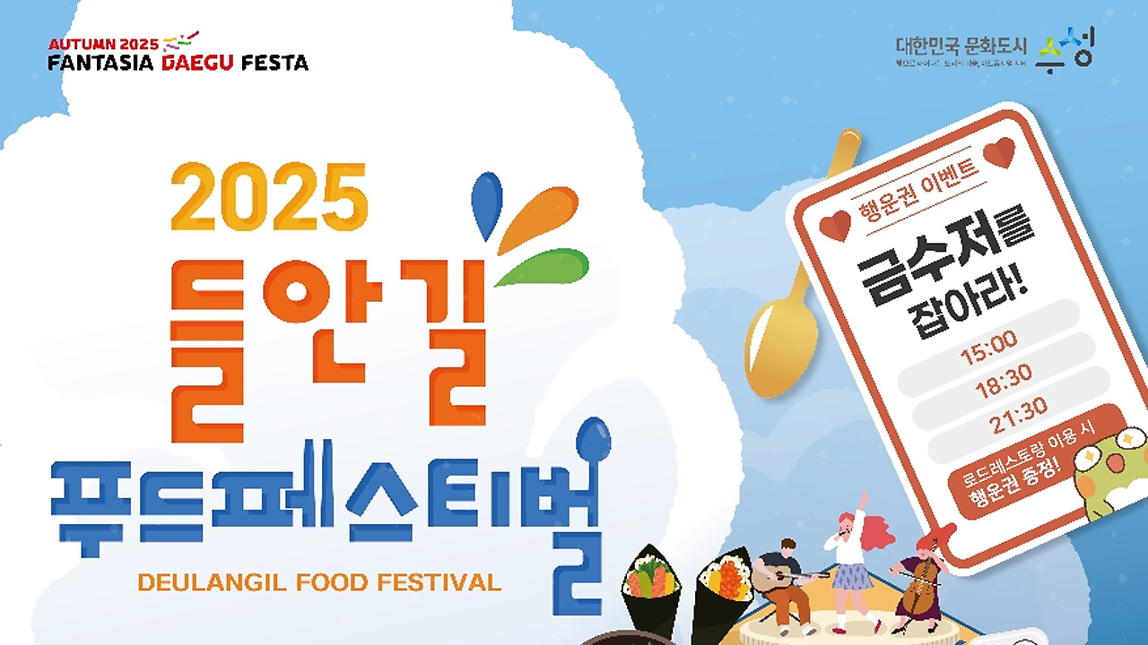 2025 들안길 푸드 페스티벌이 9월 27일 낮 12시부터 밤 10시까지 대구 수성구 들안길 일대에서 열립니다.'먹고 싶은 대로 푸드마블 들안 여행'이란 슬로건으로 열리는 이번 축제에는 50곳의 로드 레스토랑 부스가 차려져 다양한 먹거리를 제공하고 플리마켓과 버스킹 공연, 경품 이벤트 등도 진행됩니다.이번 행사로 27일 0...