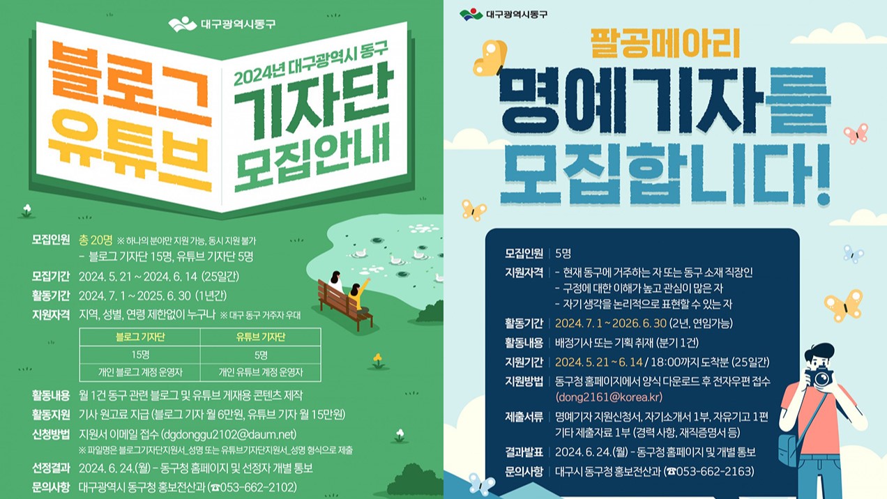 사진 제공 대구 동구대구 동구가 구청 소식지와 블로그, 유튜브 채널을 통해 구민들의 목소리를 전할 기자단을 모집합니다.모집 인원은 블로그 기자단 15명, 동구 소식지인 '팔공산 메아리' 명예 기자와 유튜브 기자단 각각 5명씩입니다.오는 7월부터 1년 동안 활동하면서 동구와 관련한 다양한 소식을 영상과 글로 전하고 ...