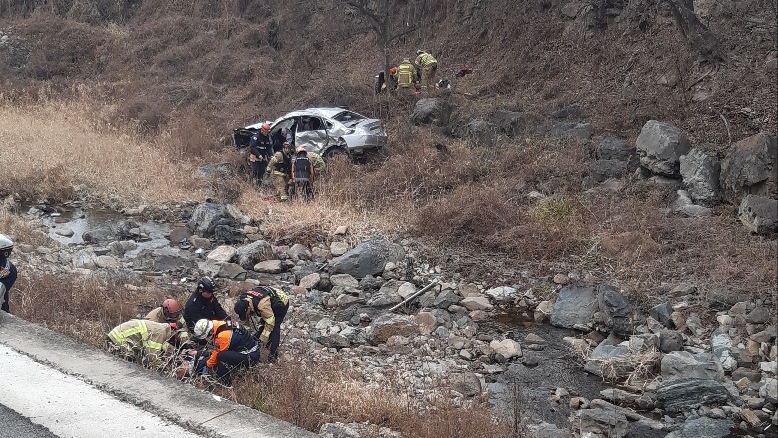 경북 영천서 내리막길 달리던 승용차 추락···1명 숨지고 3명 다쳐