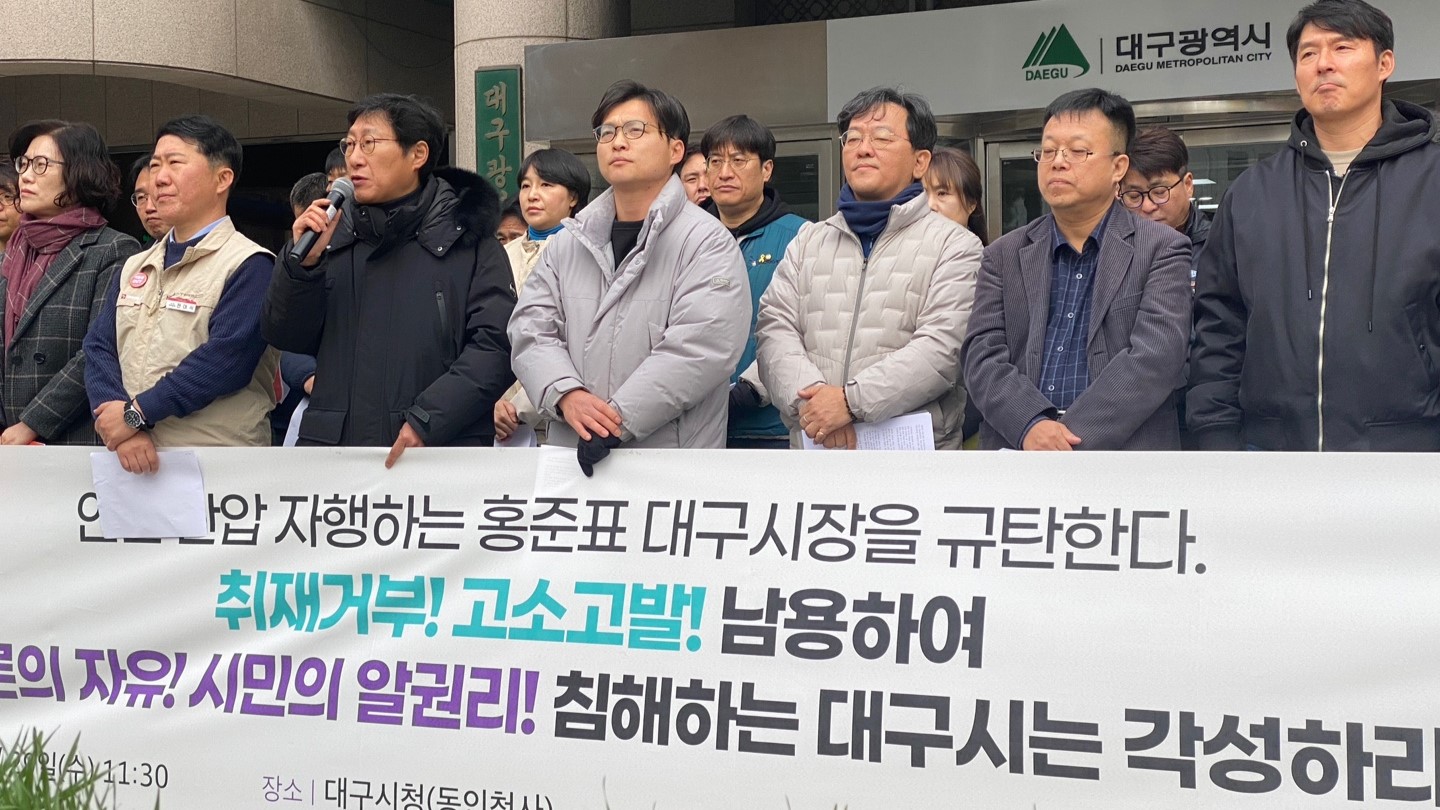 전국언론노조 대구경북협의회와 대구시민단체연대회의가 11월 29일 대구시청 앞에서 기자회견을 열고 "홍준표 대구시장이 언론 탄압을 자행하고 있다"며 규탄했습니다.이들은 "홍 시장 취임 이래 계속되는 취재 거부와 일방적 소통, 고소·고발 등이 특정 언론사와 대구시의 문제가 아니라 헌법이 보장하는 언론의 자유와 시...