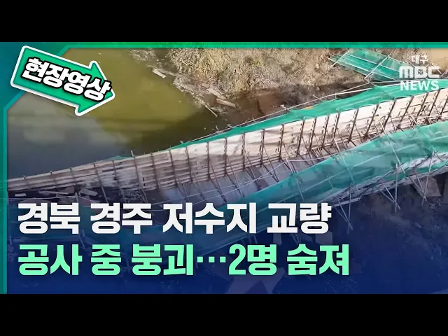 11월 27일 오전 11시 10분쯤, 경북 경주시 강동면 안계저수지 교량 건설 현장에서 구조물이 무너지는 사고가 났습니다. 작업자 8명이 7m 아래로 물에 빠졌고, 이 가운데 60대 남성 등 2명이 숨졌습니다.구조된 2명은 골절상을 입는 등 크게 다쳤고 다른 4명도 병원 치료를 받고 있습니다.경찰은 교량 콘크리트 타설 작업 중...