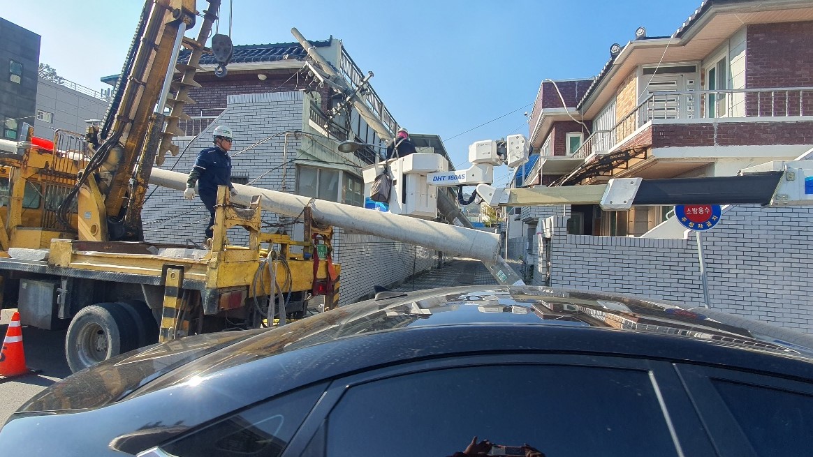 사진 제공 황영욱11월 15일 낮 12시 20분쯤 대구 북구 태전동의 한 주택가에서 전봇대가 갑자기 쓰러졌습니다.쓰러진 전신주에 부딪혀 주택 외벽 등이 일부 부서졌고, 근처 2가구에 전기가 4시간 동안 끊겼습니다.전봇대를 교체하고 복구 작업을 벌인 한국전력공사는 전봇대에 차량 충돌 흔적이 있는데 이때 생긴 균열로 전...
