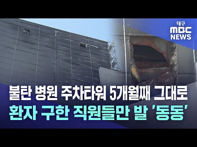 ◀앵커▶화재 소식 하나 더 전해드리겠습니다.2023년 7월 큰불이 났던 대구의 한 병원 주차타워가 철거 허가를 받지 못해 4개월 넘게 방치돼 있습니다.당시 병원 직원들이 필사적으로 환자를 대피시켜 인명피해를 막을 수 있었는데, 지금까지 원인 조사가 되지 않아 불에 탄 차량 보상을 받지 못하고 있습니다.주차타워를 철...