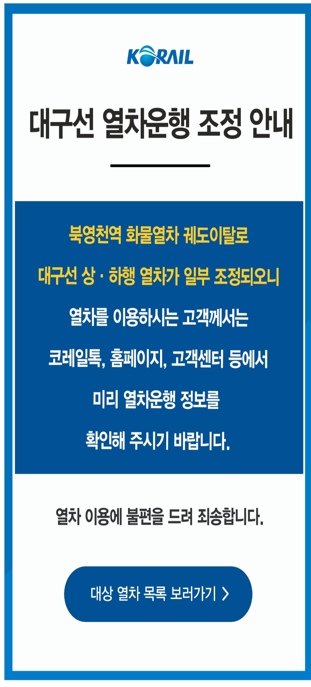 5월 10일 오전 11시 반쯤 경북 영천시 중앙선 북영천역 인근에서 달리던 화물열차 1량이 탈선하는 사고가 났습니다.사고 열차는 시멘트를 싣고 충북 제천에서 구미 신동으로 향하던 19량 길이 열차였는데, 다섯 번째 열차 1량이 궤도를 이탈했습니다. 인명피해는 없었지만, 포항과 태화강 등에서 동대구를 오가는 대구선 무...