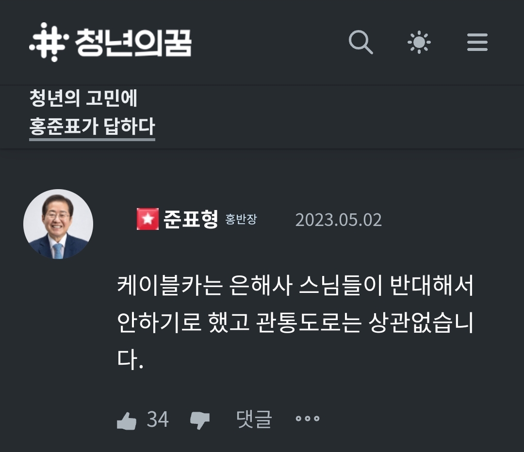 대구시가 팔공산 갓바위 케이블카 설치 사업을 중단하기로 했습니다.홍준표 시장은 5월 2일 자신의 온라인 정치 커뮤니티 '청년의 꿈' 청문홍답 코너에서 '팔공산이 국립공원이 되면 케이블카 설치나 터널을 뚫는 정책이 어려워지지 않냐'는 물음에 "케이블카는 은해사 스님들이 반대해서 안 하기로 했다"고 답했습니다.앞...