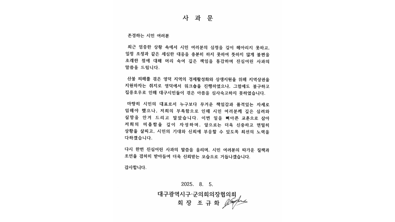 대구 기초의회 의장단이 집중호우 당시 워크숍을 떠난 것과 관련해 사과했습니다.대구광역시 구·군의회 의장협의회는 조규화 회장 명의로 사과문을 내고 "산불 피해를 겪은 영덕의 지역 상권을 지원하자는 취지로 워크숍을 진행하였으나 집중호우로 인해 대구 시민들이 겪은 아픔을 심사숙고하지 못했다"며 "깊은 책임을 통...
