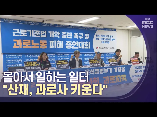 ◀앵커▶몰아서 일하고 몰아서 쉴 수 있는 근로기준법 개정안을 정부가 다음 주 입법 예고했습니다.개정안이 그대로 시행되면 '만성 과로 일터'가 보편화되고 산업재해도 크게 늘 거라는 비판이 거셉니다.최대 근로 시간이 일주일에 69시간까지 늘 것으로 알려져 있습니다만 경우에 따라 주 80시간 이상이 될 수도 있다고 합...