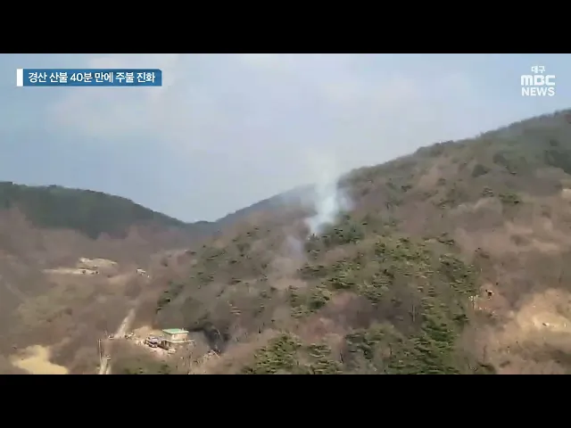 3월 9일 오후 1시 40분쯤, 경북 경산시 용성면의 한 야산에서 불이 났습니다.산림과 소방 당국은 헬기 1대, 인력 50여 명을 투입해 40분 만에 주불을 진화했습니다.인명피해는 없는 것으로 파악됐습니다. 산림청은 산 중턱에 위치한 펜션에서 난 불이 산림으로 번진 것으로 추정하고 있습니다.(영상 제공 산림청)