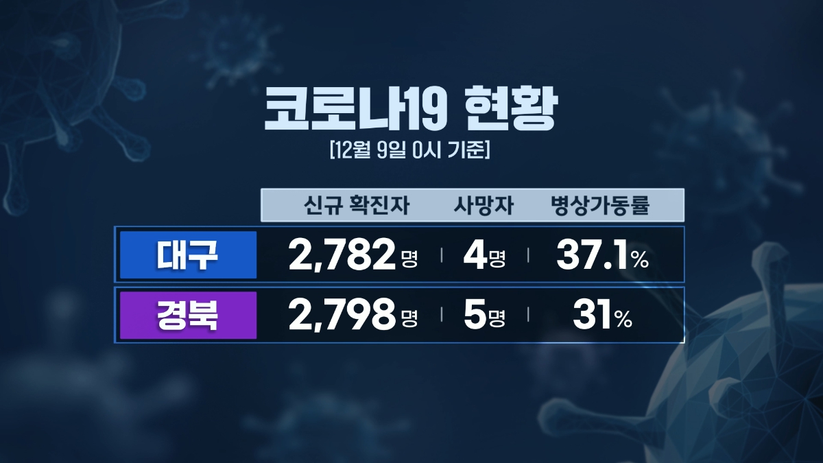 12월 9일 0시 기준 코로나 19 신규 확진자는 대구 2,782명, 경북 2,798명 발생했습니다.지난주 같은 요일보다 대구는 375명, 경북은 206명 늘어났습니다.코로나 관련 사망자도 대구에서 4명 경북에서 5명 더 나왔습니다.코로나 19 전담 치료 병상 가동률은 대구 37.1%, 경북 31%이고, 재택치료자는 대구 14,500여 명, 경북...