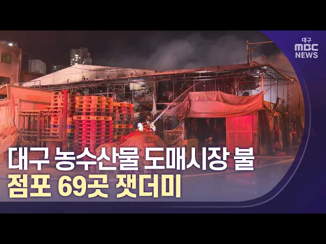 ◀앵커▶10월 25일 밤 대구 북구 매천동 농수산물 도매시장에서 큰불이 났습니다.불은 3시간 반 만에 꺼졌고 대부분 장사를 끝낸 뒤라 다친 사람도 없었습니다.하지만 순식간에 번진 불길에 60곳이 넘는 과일과 야채 가게들이 잿더미가 됐습니다.손은민 기자입니다. ◀기자▶시뻘건 불길이 시장을 뒤덮었습니다.그 사이로 검은 ...