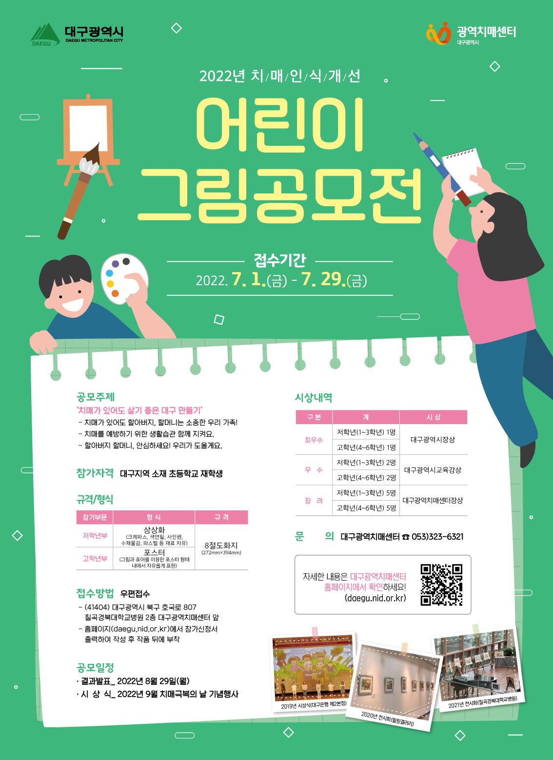치매에 대한 인식을 바꾸기 위한 어린이 그림 공모전이 7월 29일까지 열립니다.대구 소재 초등학교 학생이면 누구나 참여할 수 있습니다. 치매 어르신을 위해 내가 도울 수 있는 일이나 우리 지역에서 치매 어르신과 함께 살아가는 방법, 치매 예방을 위한 노력 등을 주제로 그림을 그리면 됩니다.전문가 심사를 거쳐 최우...