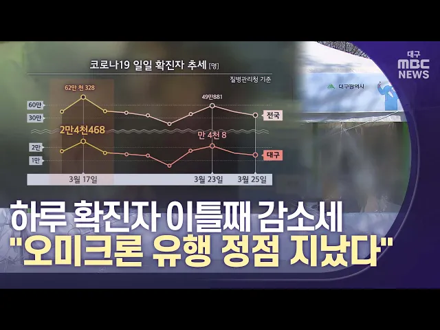 ◀앵커▶대구·경북에서 각각 만 5천 명 안팎의 확진자가 나오면서 이틀째 감소세를 보였습니다. 국내 누적 확진자는 천 백만 명을 넘었습니다.전체 인구의 20%, 5명 중 1명 넘게 감염된 건데요,정부는 오미크론 유행이 정점을 지났다고 조심스럽게 예측했습니다.손은민 기자입니다. ◀기자▶대구의 신규 확진자는 전날보다 천 ...