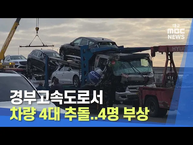오늘 아침 8시 30분쯤 대구 북구 경북고속도로 서울방향 금호분기점 인근에서 승용차와 트럭 등 차량 4대가 추돌하는 사고가 났습니다.이 사고로 승용차 운전자 등 4명이 다쳐 병원으로 옮겨졌습니다. 경찰은 정확한 사고 원인을 조사하고 있습니다.