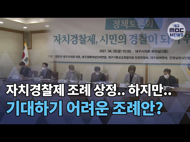 ◀ANC▶오는 7월, 자치경찰제 전면 시행을 앞두고 대구시의회에도 관련 조례가 상정됐습니다.그런데 조례안을 보면 애초 취지였던 경찰권 분산도, 지역 맞춤형 경찰 서비스도기대하기 어렵다는 지적이 나옵니다.손은민 기자입니다. ◀END▶ ◀VCR▶중앙 정부가 아니라 각 지자체 지휘 아래에 있는 자치경찰.맡는 업무는...