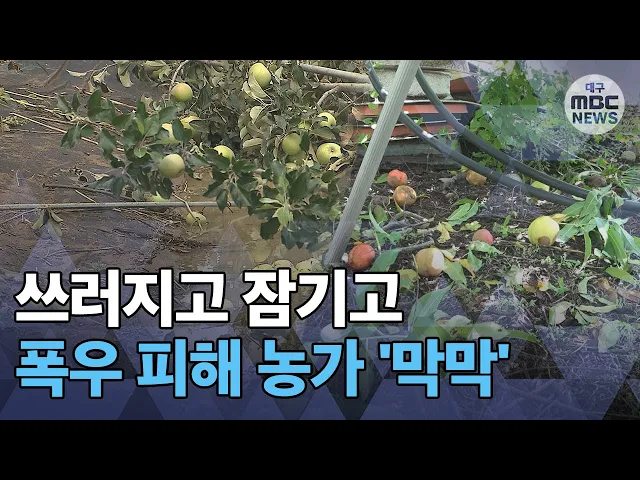 ◀ANC▶[남]지난 주말부터 내린 폭우로 대구·경북 지역의 농가들도 큰 피해를 봤습니다.오늘은 긴 장마에 직격탄을 맞은 지역 농가의 막막한 상황을 연이어 전해드립니다.[여]폭우로 사과나무가 뿌리째 뽑히고, 참깨며 옥수수며 농작물은 물에 잠겨 수확이 어려워졌습니다.먼저 손은민 기자의 현장 취재를 보시겠습니다. ...