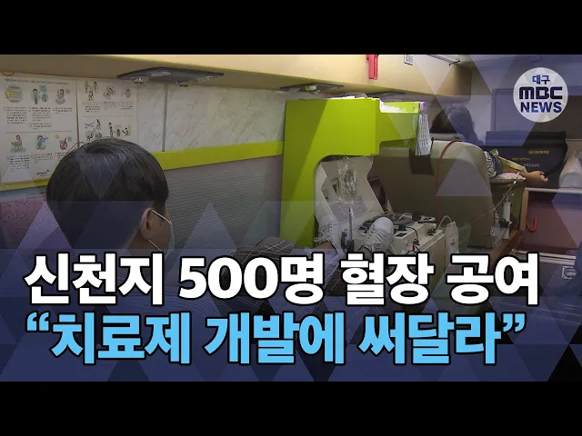 ◀ANC▶코로나19 치료제를 만들려면 감염됐다 나은 사람들의 피가 필요한데요.집단 감염이 발생한 신천지 대구교회 교인 500명이 혈장 기증에 나섰습니다.이 혈장은 곧 임상시험에 들어가는혈장 치료제를 만드는 데 쓰일 예정입니다.손은민 기자입니다. ◀END▶ ◀VCR▶경북대병원 앞에 채혈 버스 3대가줄지어 서 있습...