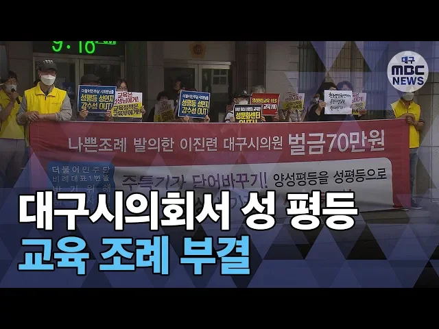 ◀ANC▶성평등 교육 환경을 만들자는 조례를 두고오늘 대구시의회 안팎이 소란했습니다.조례는 온라인 성 착취 범죄,n번방 사건의 피해자와 가해자 대부분이 미성년자였던 만큼, 학교에서 제대로 된 성 인식을 교육하자는 취지였지만,동성애를 옹호한다는 논란에 휩싸이면서 결국 상임위 문턱을 넘지 못했습니다.손은민 ...