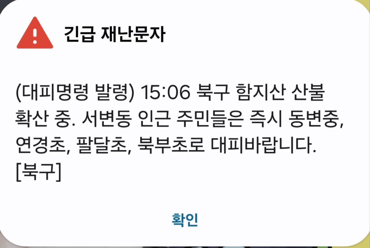 대구 북구 함지산 산불이 재발화하면서 서변동 일대 주민들에게 대피령이 내려졌습니다.대구 북구청은 4월 30일 오후 5시 6분 "북구 함지산 산불 확산 중"이라며 "서변동 인근 주민들은 즉시 동변중, 연경초, 팔달초, 북부초로 대피바랍니다"라는 긴급재난문자를 발송했습니다.