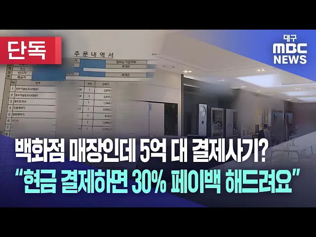 ◀앵커▶대구의 한 백화점에 있는 대기업 가전 매장에서 5억 대 결제 사기가 일어났다는 소식, 어제 전해드렸는데요.이런 일이 어떻게 가능했을까요? 손은민 기자가 취재했습니다.◀기자▶결제 사기 피해자들은 여러 매장에서 구매할 가전의 견적을 받았지만 '이 매장'에서 현금으로 결제했을 때 금액이 가장 저렴했다고 말합니...