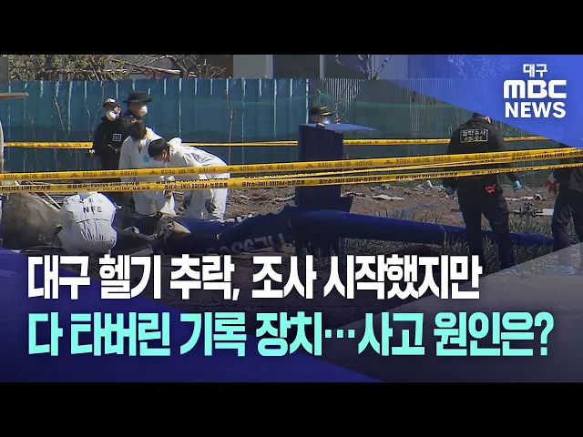 ◀앵커▶4월 6일 대구에서 발생한 산불 헬기 추락 사고의 원인을 밝히기 위한 조사가 시작됐습니다.강풍 때문이다, 노후 기체가 문제였다, 여러 의혹이 나오는데 비행 기록이 담긴 장치가 다 타버려서 조사 기간이 길어질 거란 전망이 나옵니다. 손은민 기자입니다.◀기자▶통제선 안에 형체를 알아볼 수 있는 건 헬기 꼬리 부...