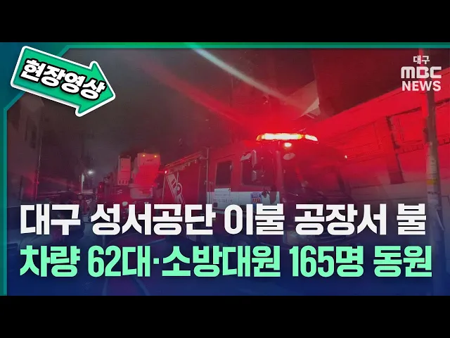 1월 9일 밤 9시 10분쯤 대구 달서구 월암동 성서공단에 있는 이불 공장에서 큰불이 났습니다.소방 당국은 화재 신고 27분 만에 관할 소방서의 소방력을 모두 동원하는 대응 1단계를 발령했고 차량 60여 대, 인력 160여 명을 투입해 7시간 만에 불을 완전히 껐습니다.공장 안에 있던 50대 직원이 연기를 들이마셔 병원으로 ...