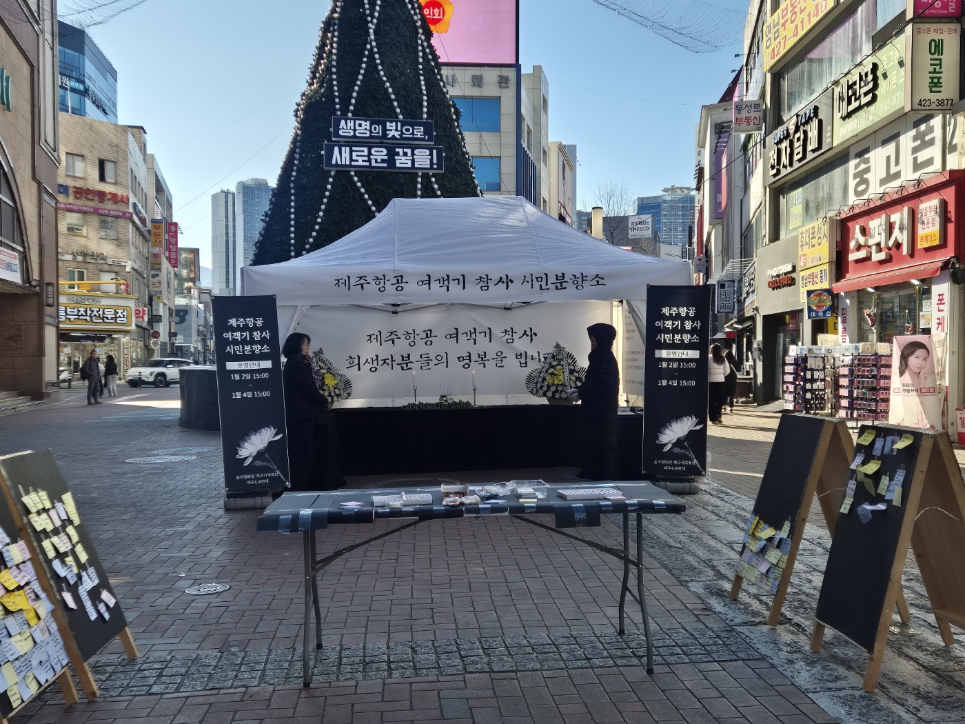 대구 중구 옛 대구백화점 앞 광장에 차려진 제주항공 여객기 참사 시민 분향소에 이틀째 시민들 발길이 이어지고 있습니다.분향소를 설치·운영하는 대구시국회의와 대구4.16연대는 "반복되는 참사로 인해 더 이상 소중한 사람들을 잃지 않도록 철저한 진상조사가 진행되길 원한다"며 희생자들의 명복을 빌었습니다.시민 분...