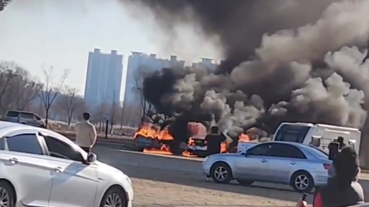 경북 구미 공원 주차장서 승용차에 큰불···옆에 있던 캠핑카 두 대도 불에 타