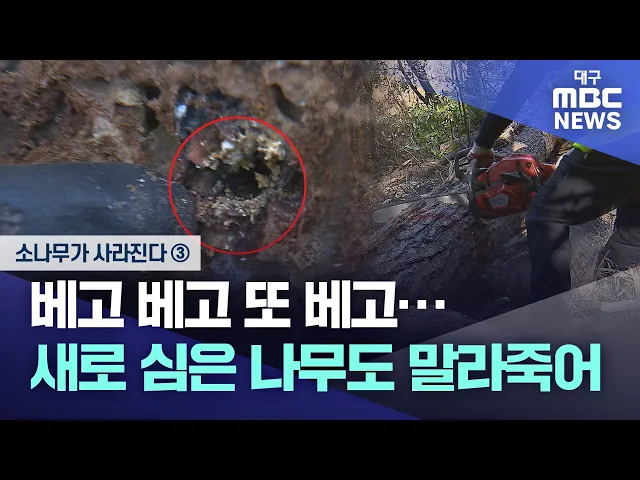 ◀앵커▶대구 달성군에서만 올 한 해 6만 그루 넘는 소나무가 재선충병으로 잘려나갔습니다.산림청이 집계한 대구시 전체 감염목 규모를 이미 넘어선 숫자입니다.나무를 다 베어낸 곳에는 다른 종류의 나무로 숲을 만드는 '수종전환'이 진행 중인데 저희 취재진이 돌아보니 새로 심은 나무마저 다 말라죽어가고 있었습니다.지...
