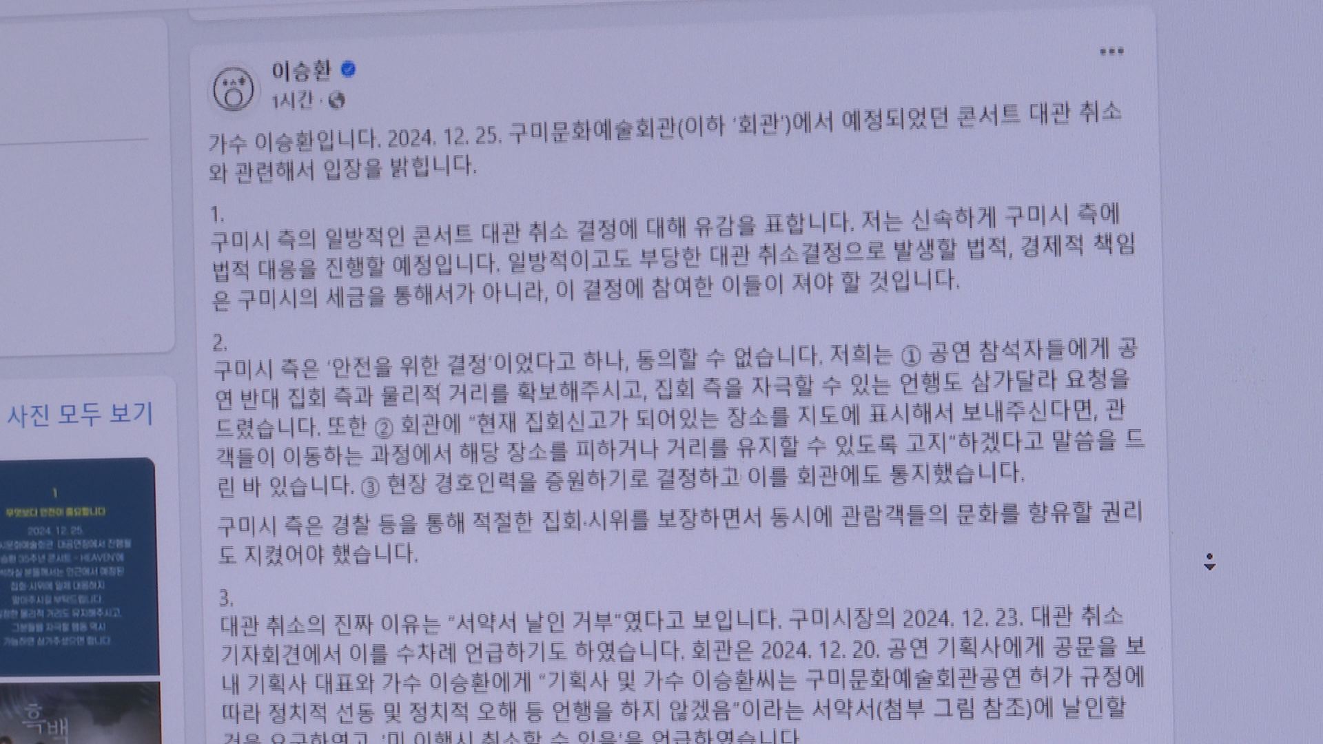 경북 구미시가 12월 25일 예정됐던 가수 이승환의 데뷔 35주년 기념 콘서트 대관을 취소했습니다.김장호 구미시장은 12월 23일 입장문을 내고 "시민과 관객의 안전을 고려해 구미시문화예술회관 운영 조례에 따라 대관을 취소하게 됐다"고 밝혔습니다.김 시장은 "이승환 씨 측에 안전 인력 배치 계획 제출과 '정치적 선동 ...