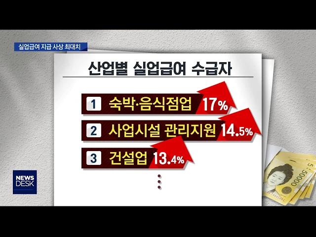 ◀ANC▶ 경기가 어려운 탓에 고용 사정이 나빠지면서 실업급여가 사상 최대치를 기록했습니다. 실업자가 늘기도 늘었지만, 웬만한 사업장은 실업급여 대상에 포함됐고 상한액이 올라간 것도 원인입니다. 한태연 기자가 보도합니다. ◀END▶ ◀VCR▶ 실업급여를 신청하는 대구 고용복지센터에 실업자 발길이 이어지고 있...