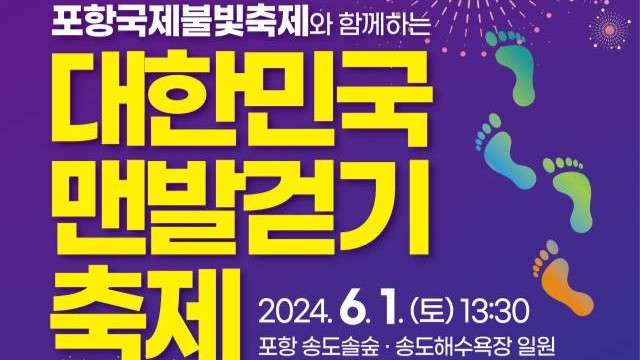 사진 제공 포항시'제2회 대한민국 맨발 걷기 축제'가 오는 6월 1일 포항 송도 솔밭에서 열립니다. 포항시가 주최하고 맨발 학교 포항지회가 주관하는 이번 축제는 포항국제불빛축제와 함께하는 행사로 숲과 바다를 보며 걸을 수 있는 포항만의 지역 특성을 살린 코스로 구성됐습니다. 맨발 노래자랑에 참가하거나 각종 게임...