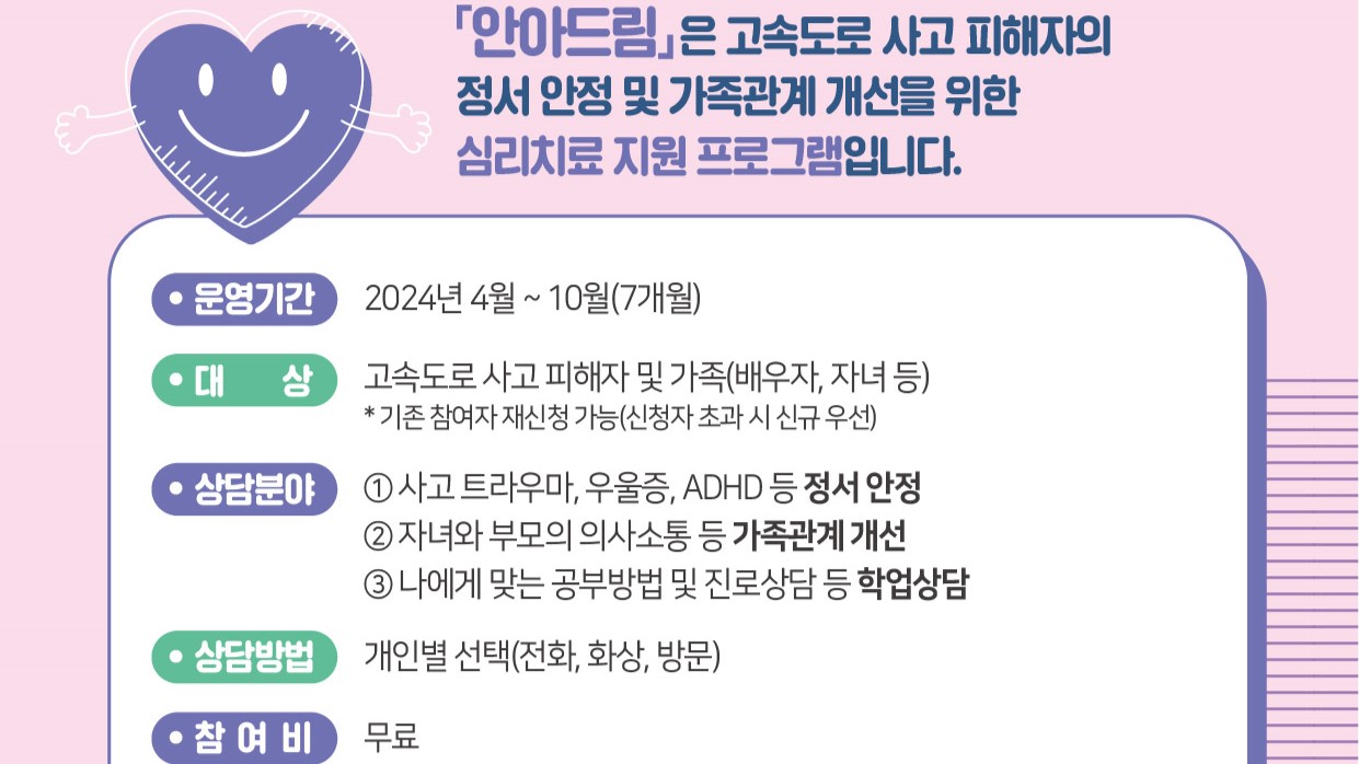 한국도로공사는 고속도로 사고 피해자와 가족을 위해 심리치료 프로그램을 진행합니다.'안아드림'이라는 이 프로그램은 고속도로 사고 후유증으로 심리적 어려움을 겪고 있는 사람들에게 정서적 안정을 주고 가족관계 개선에 도움을 주기 위해 마련됐습니다.온라인 사전 심리검사를 통해 대상을 선정한 뒤 전화·화상·방문 ...